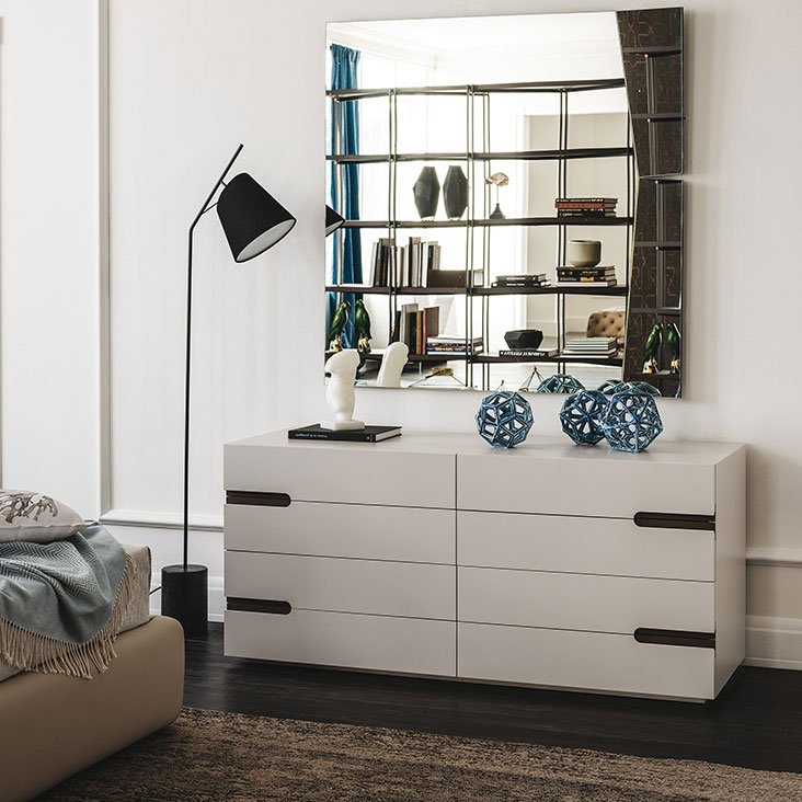 Прикроватная тумбочка, доступная в двух размерах и высотах, с двумя выдвижными ящиками, комод с 4/8 выдвижными ящиками со структурой и фасадом в дереве, лакированном в гофрированный графитовый (GF69) устричный цвет (GF50), или в шпоне из ореха (NC) или обоженного дуба (RB). Вставки из мягкой или синтетической кожи цветов согласно образцам. Версия А с базой в стали, окрашенной в гофрированный графит (GFM69).