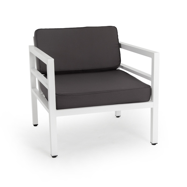 В комплекте на сидениях и спинке предусмотрены подушки контрастного темно-серого оттенка со съёмными чехлами. Строгое лаконичное кресло подходит для использования на открытом воздухе и в помещении, в том числе и в зоне повышенной влажности.