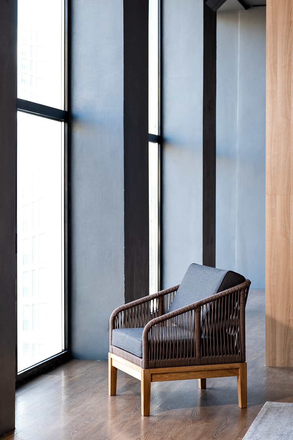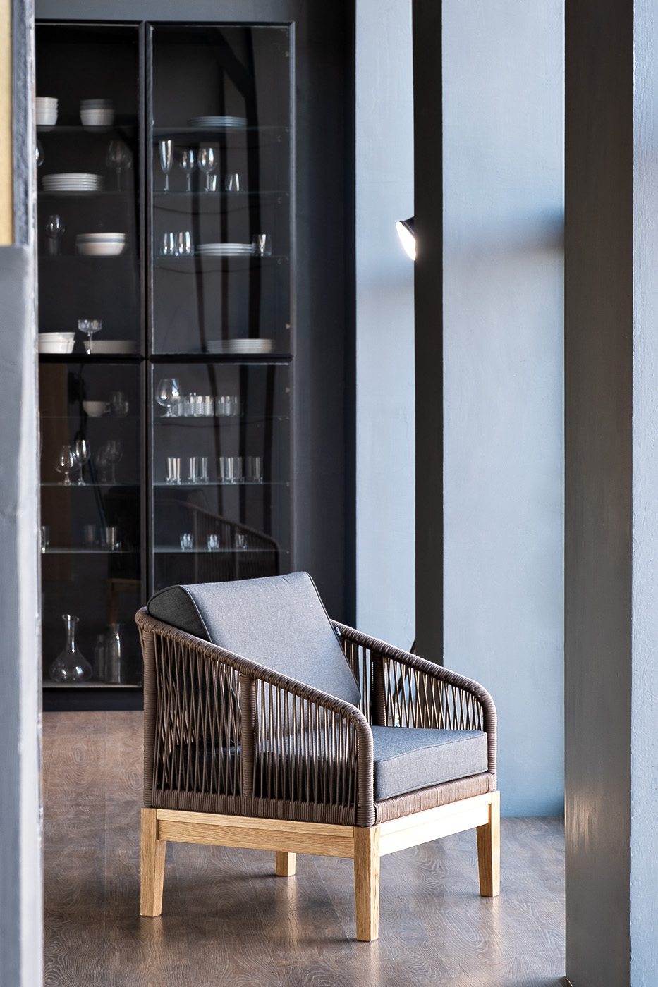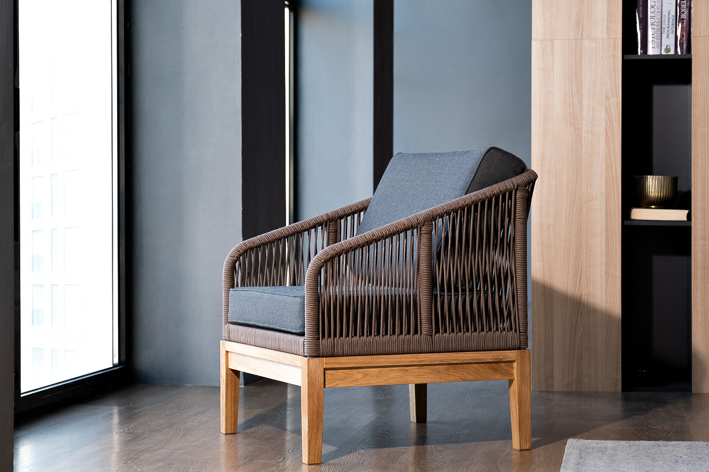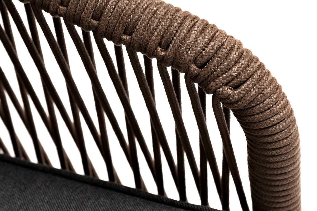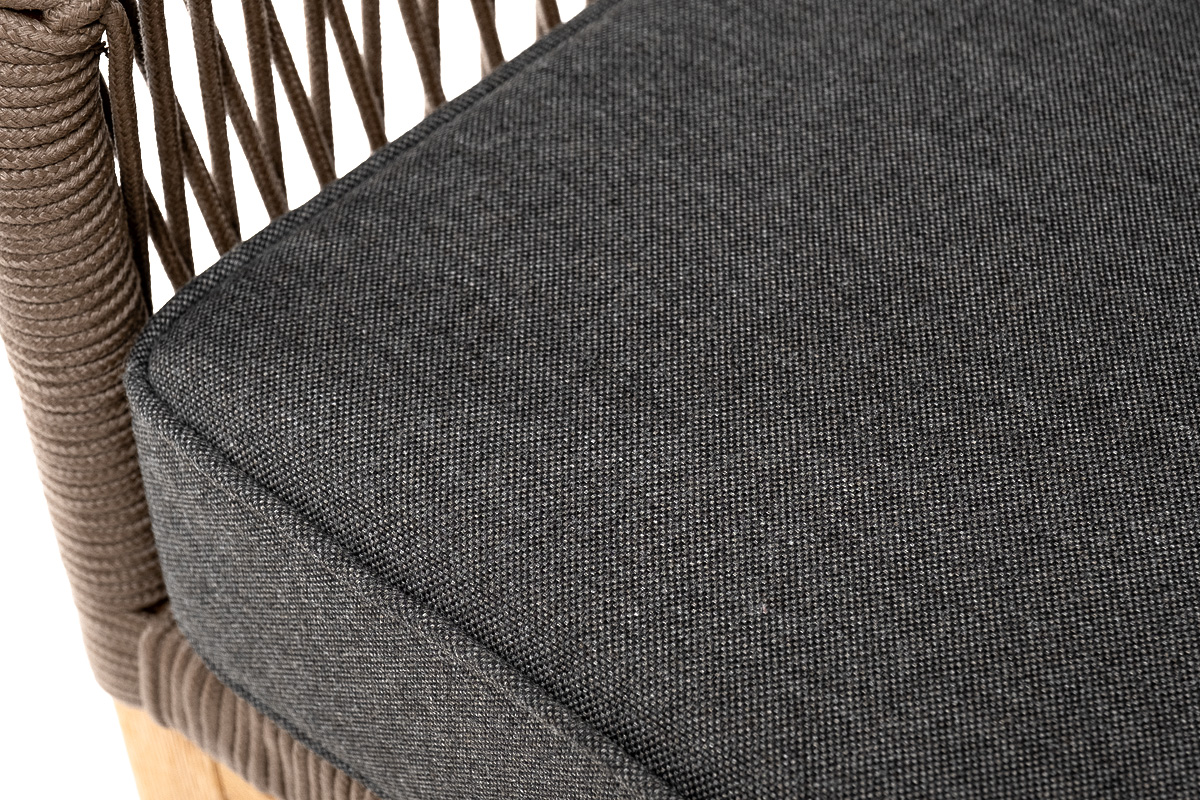 "Канны" кресло плетеное из роупа, основание дуб, роуп коричневый круглый, ткань темно-серая 027