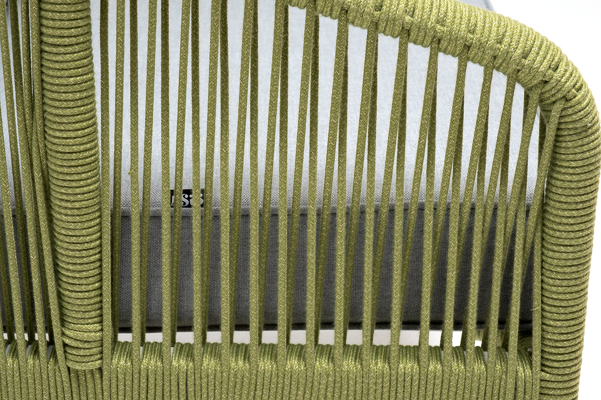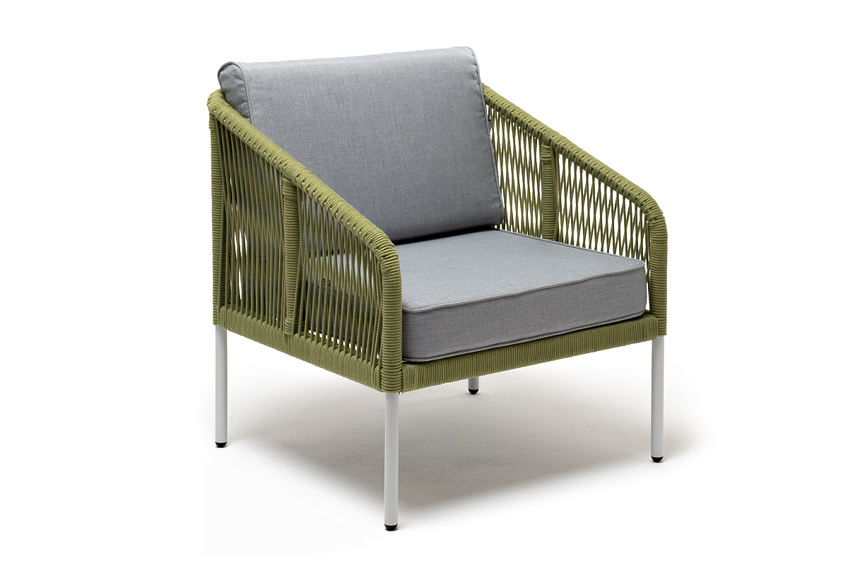 "Канны" кресло плетеное из роупа, каркас алюминий светло-серый (RAL7035) муар, роуп салатовый меланж круглый, ткань светло-серая