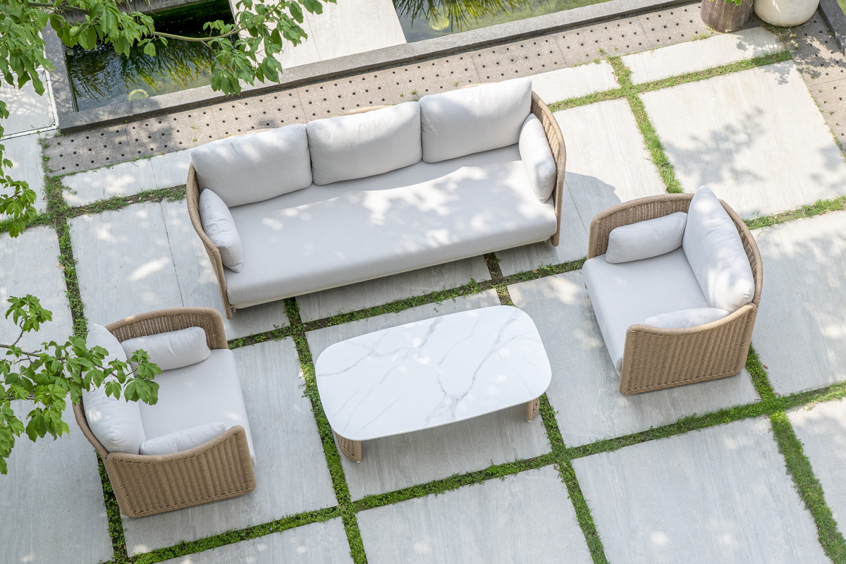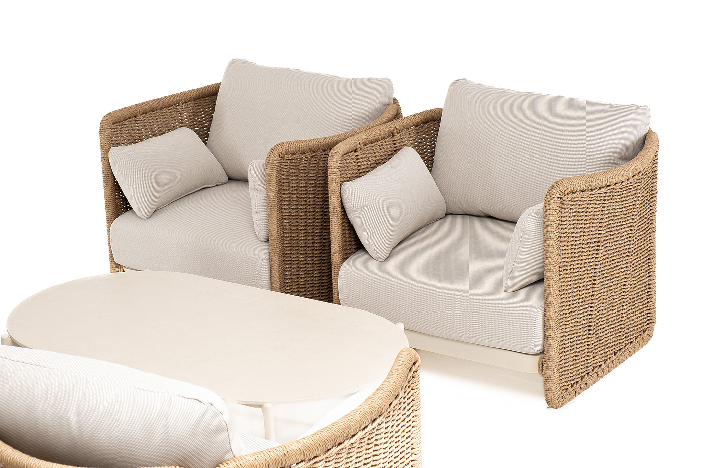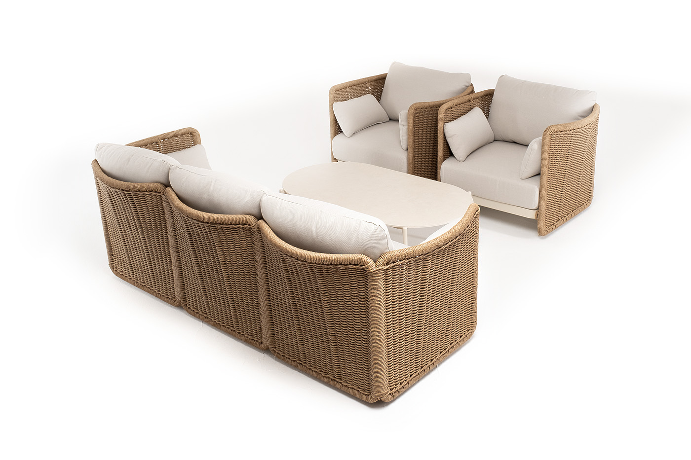 Журнальный столик выполнен из алюминия, окрашенного износостойкой краской, а его оплетка выполнена из круглого искусственного ротанга ручного плетения - 7 мм соломенного цвета. Столешница - овальная, выполнена из искусственного камня белового цвета.