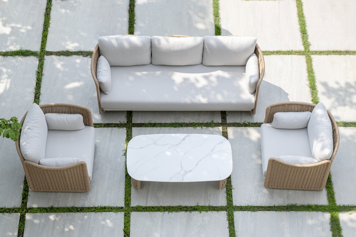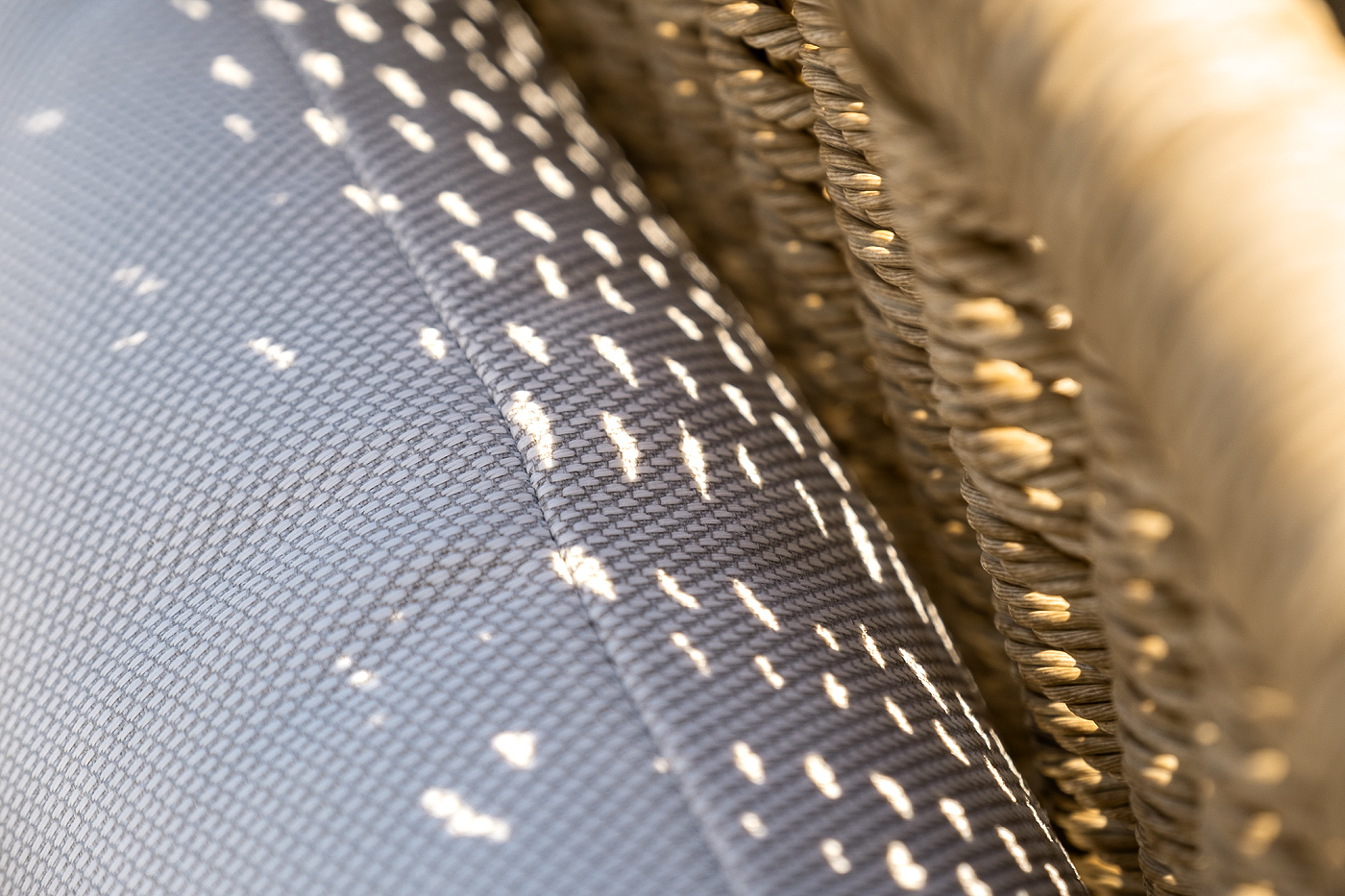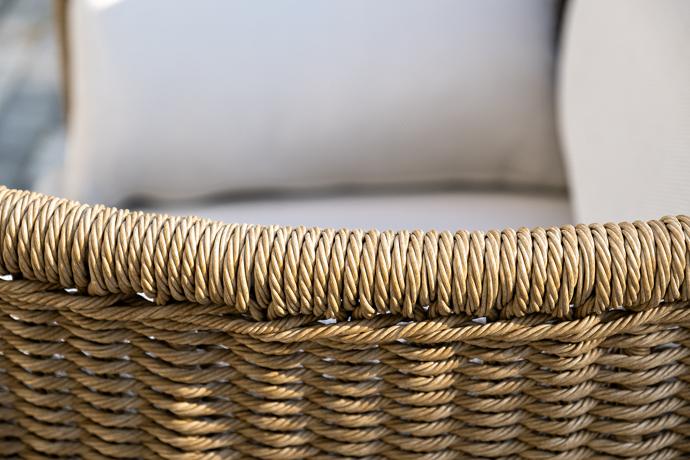 Плетеная мебель дополнена удобными подушками в бежевых чехлах. При их изготовлении используют полиэстер, плотность – 300гр/м2. Он обрабатывается влагоотталкивающей пропиткой для повышения защитных свойств материала.