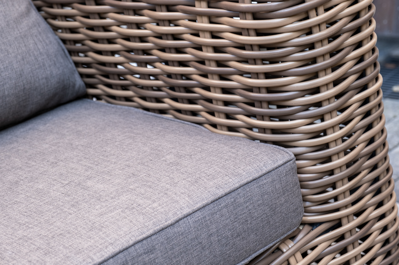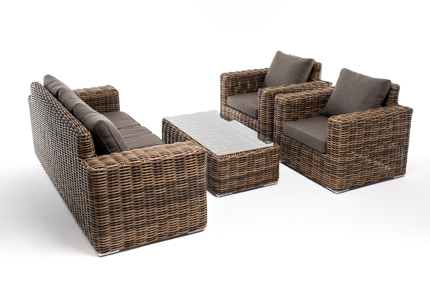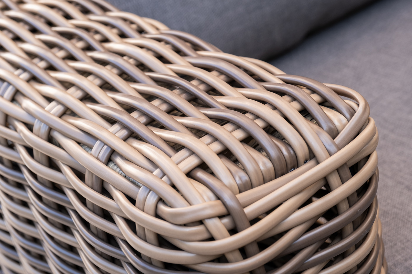 Плетеная мебель дополнена удобными подушками в серо-коричневых чехлах. При их изготовлении используют полиэстер, плотность – 230гр/м2. Он обрабатывается влагоотталкивающей пропиткой для повышения защитных свойств материала.