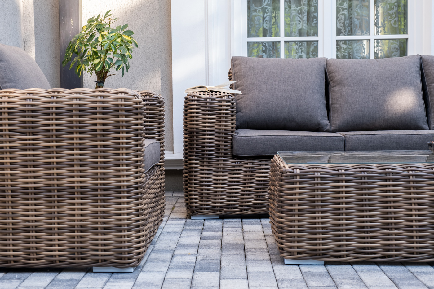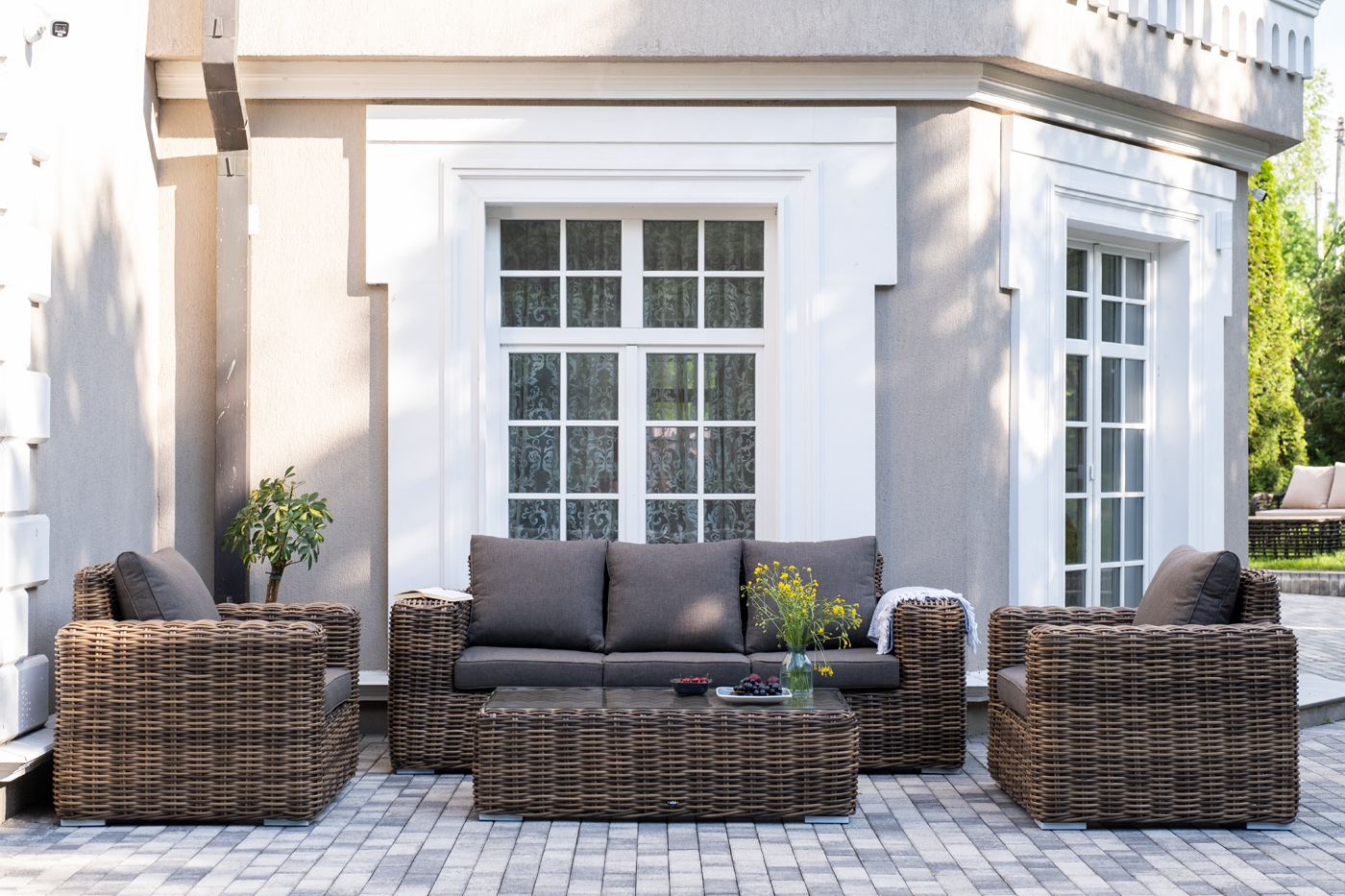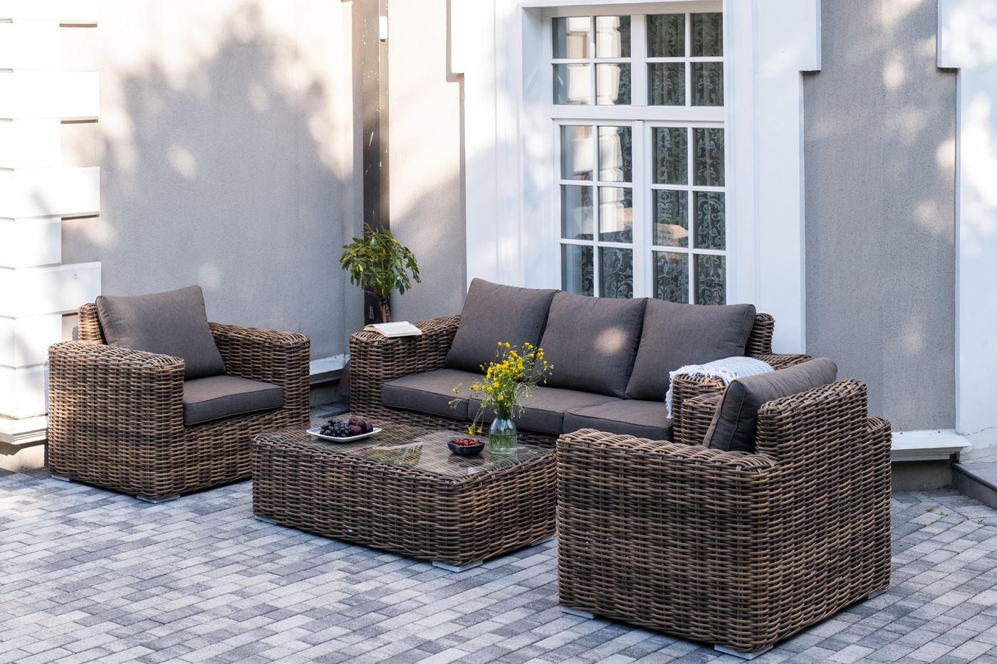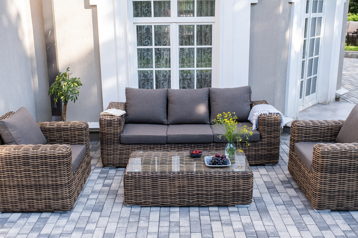 Плетеная мебель дополнена удобными подушками в серо-коричневых чехлах. При их изготовлении используют полиэстер, плотность – 230гр/м2. Он обрабатывается влагоотталкивающей пропиткой для повышения защитных свойств материала.