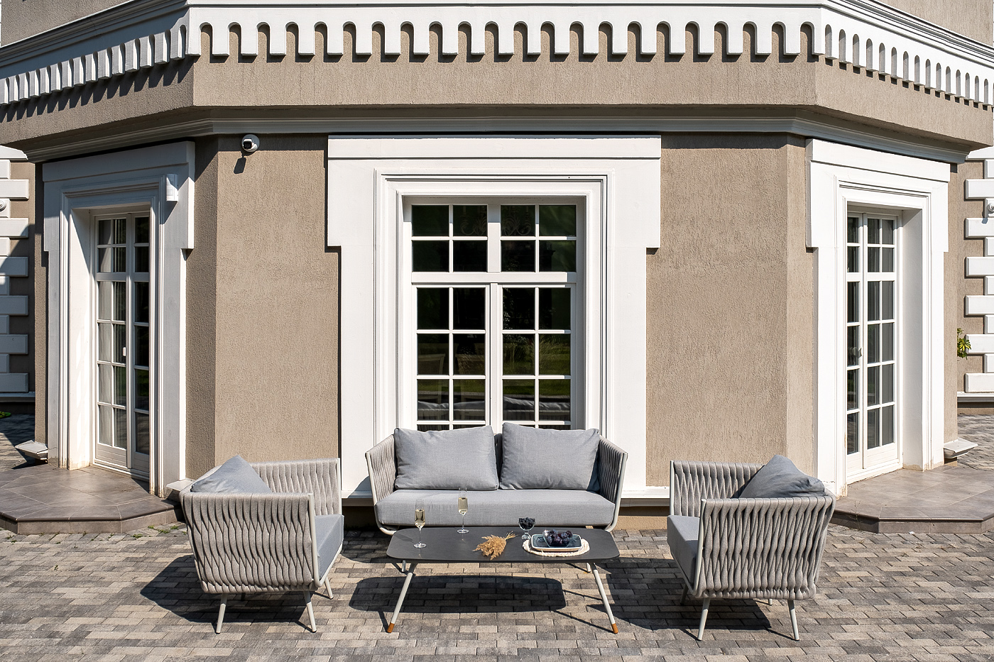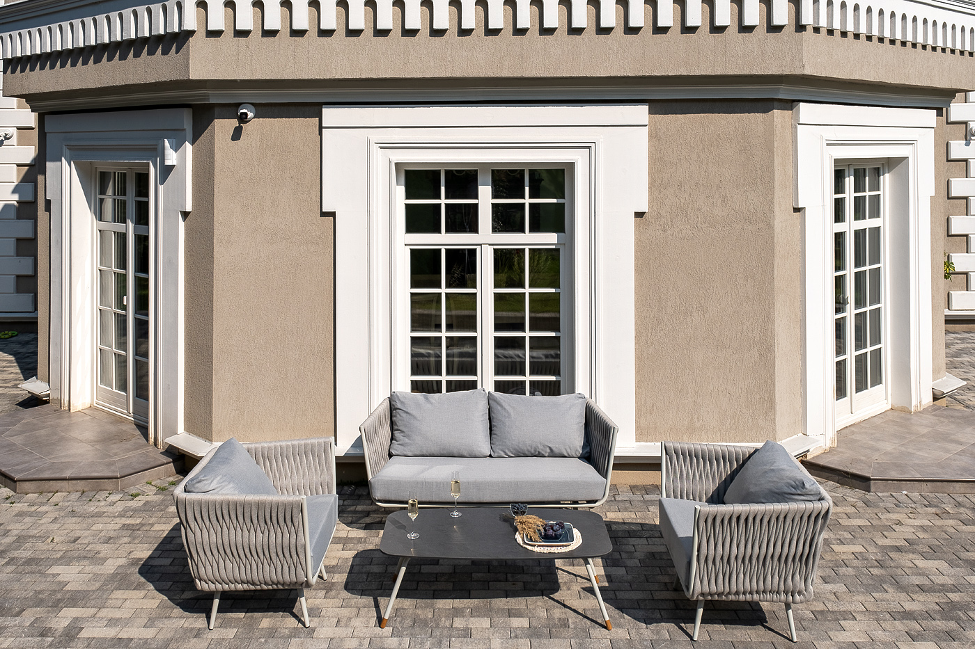 Каркас уличной мебели выполнен из алюминия. Его дополняет светло-серая оплетка, изготовленная на основе эластичных синтетических лент из полиэфирных волокон высокой прочности.