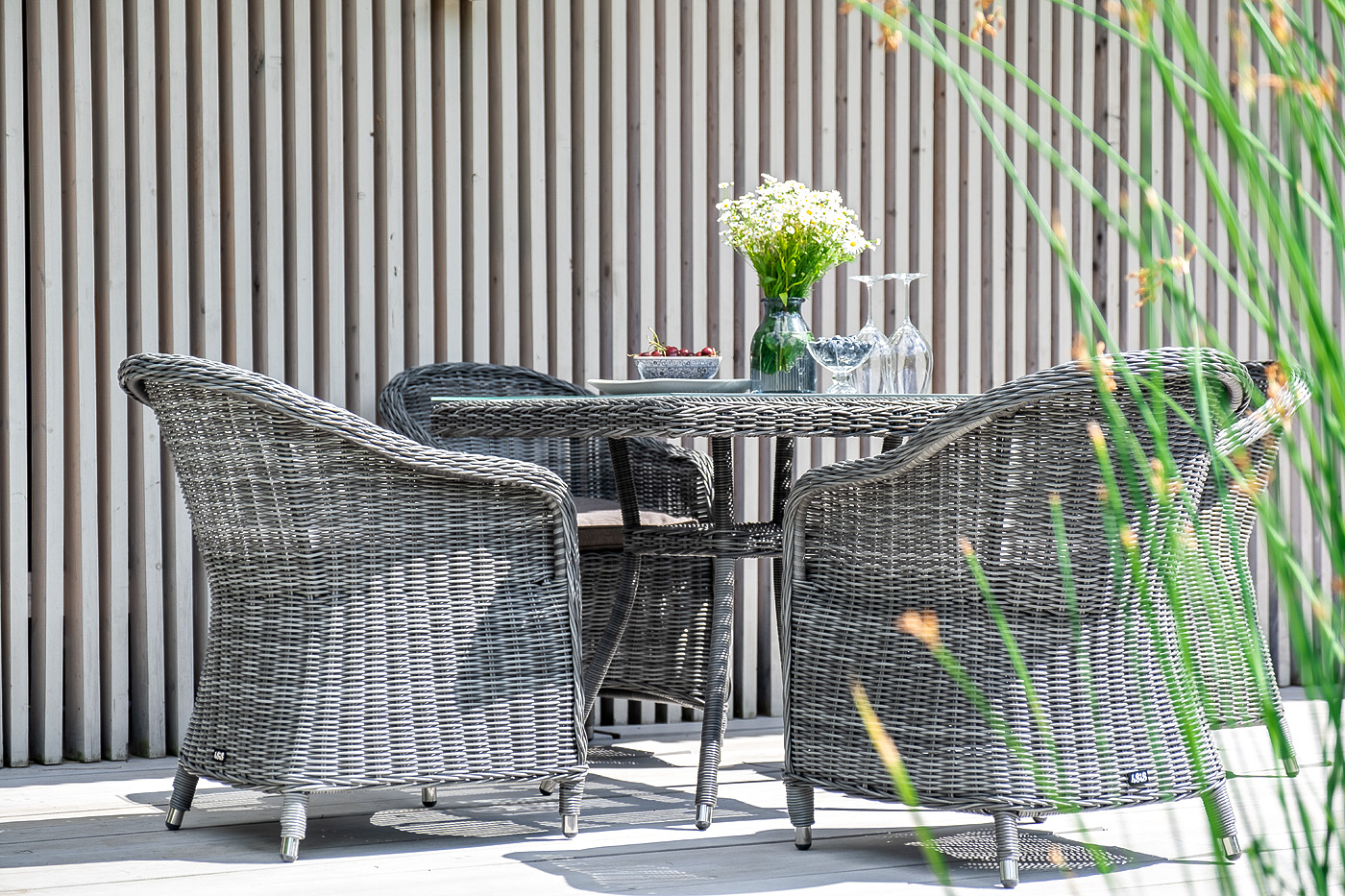 Благодаря столешнице из ударопрочного стекла толщиной 5 мм, можно не опасаясь ставить горячую посуду. Каркас изготовлен из прочного алюминия, оплетенного ротангом графитового цвета.